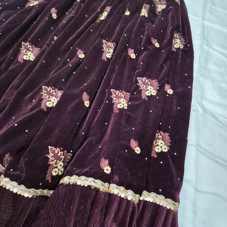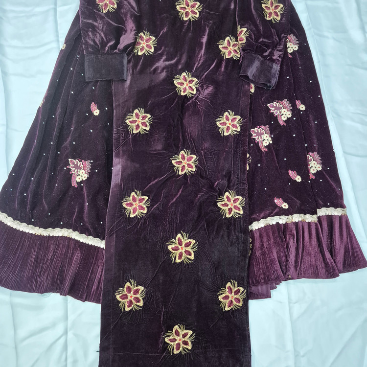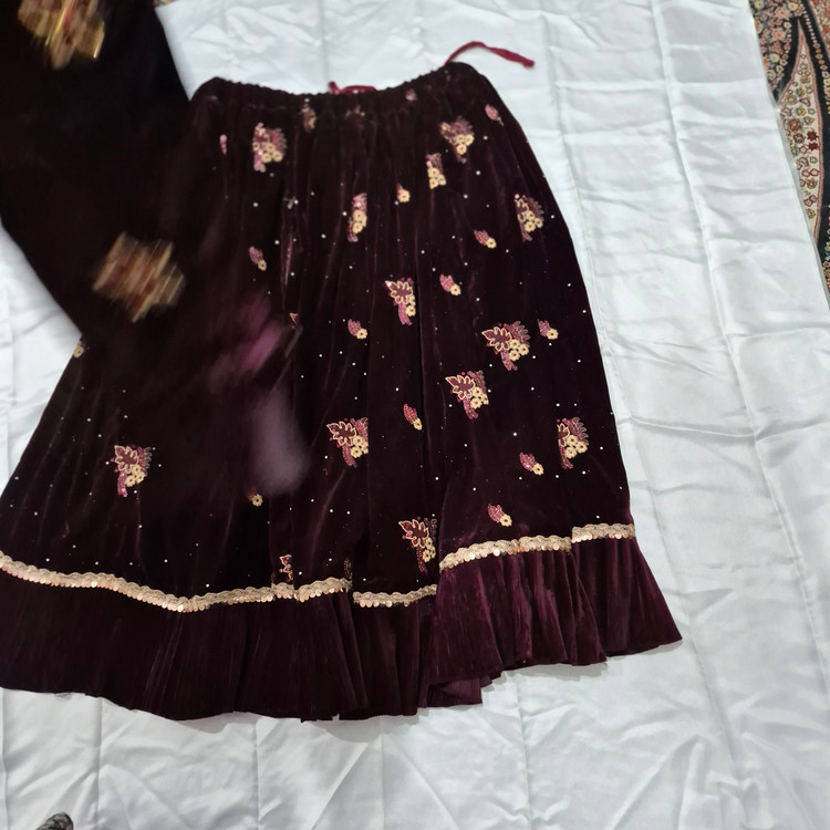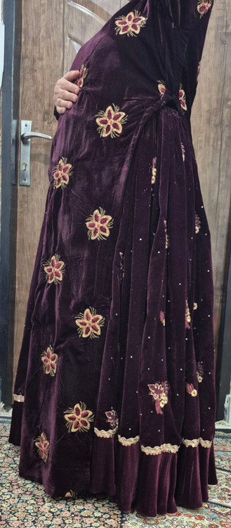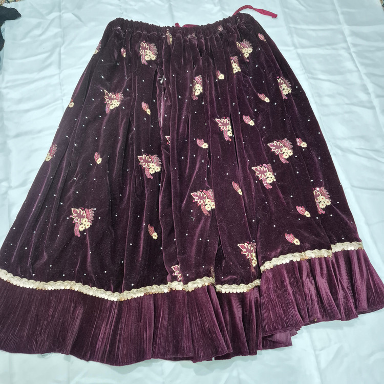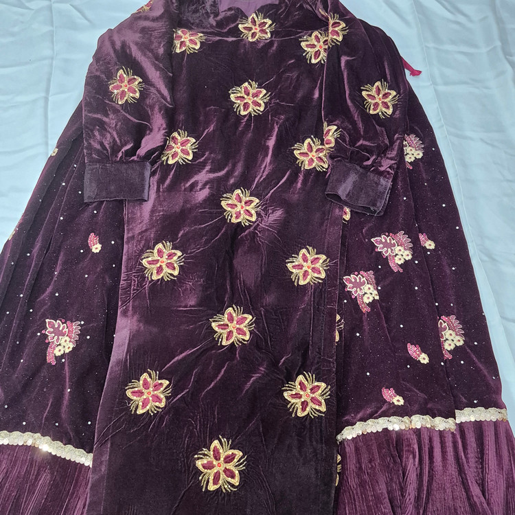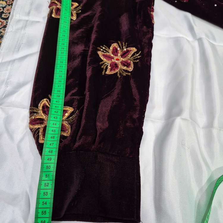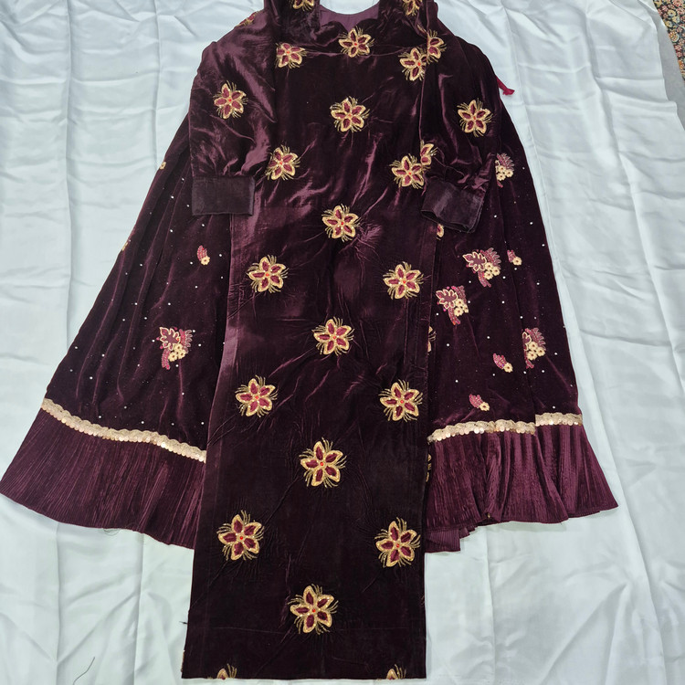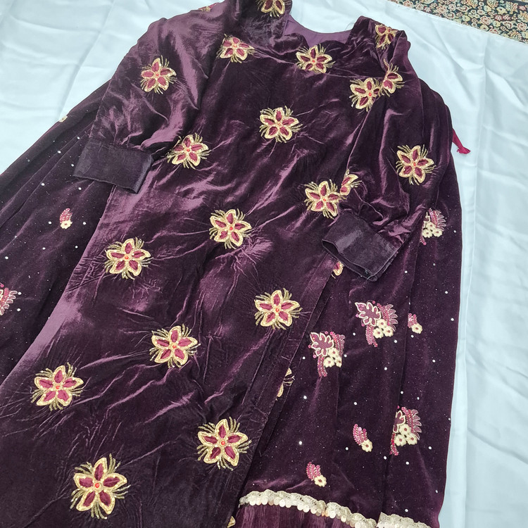 لباس محلی زنانه از جنس مخمل و عنابی رنگ به فروش می رسد.