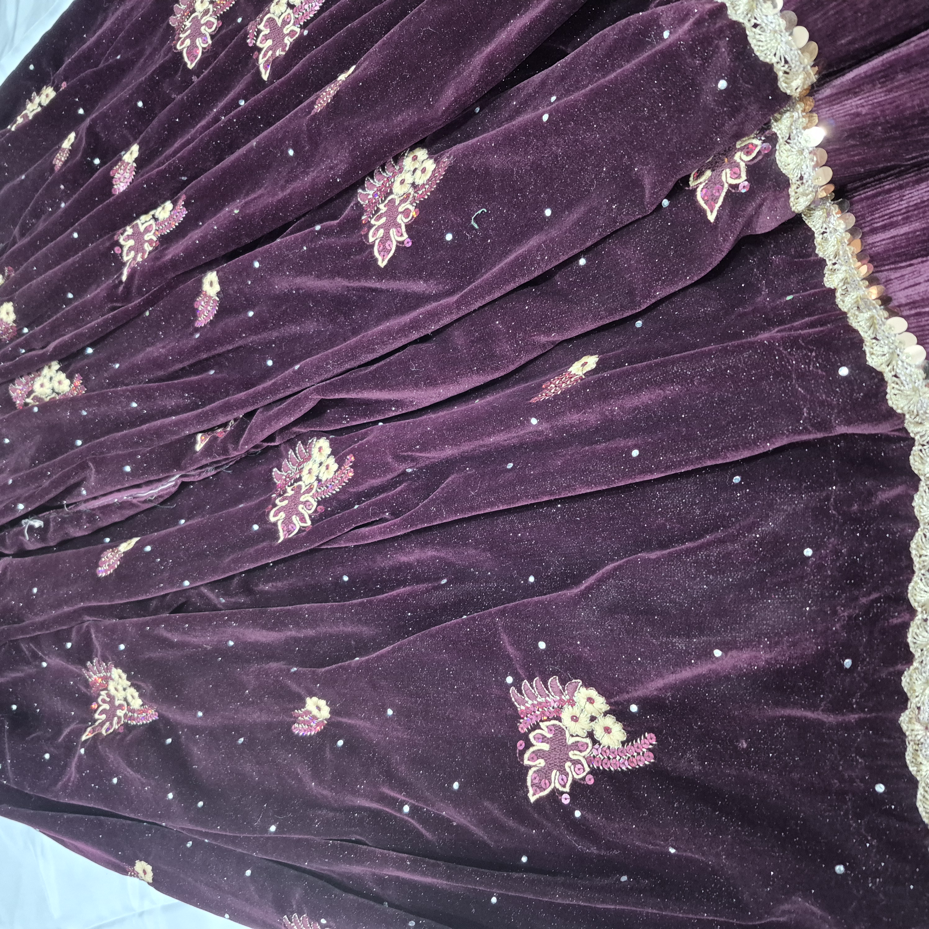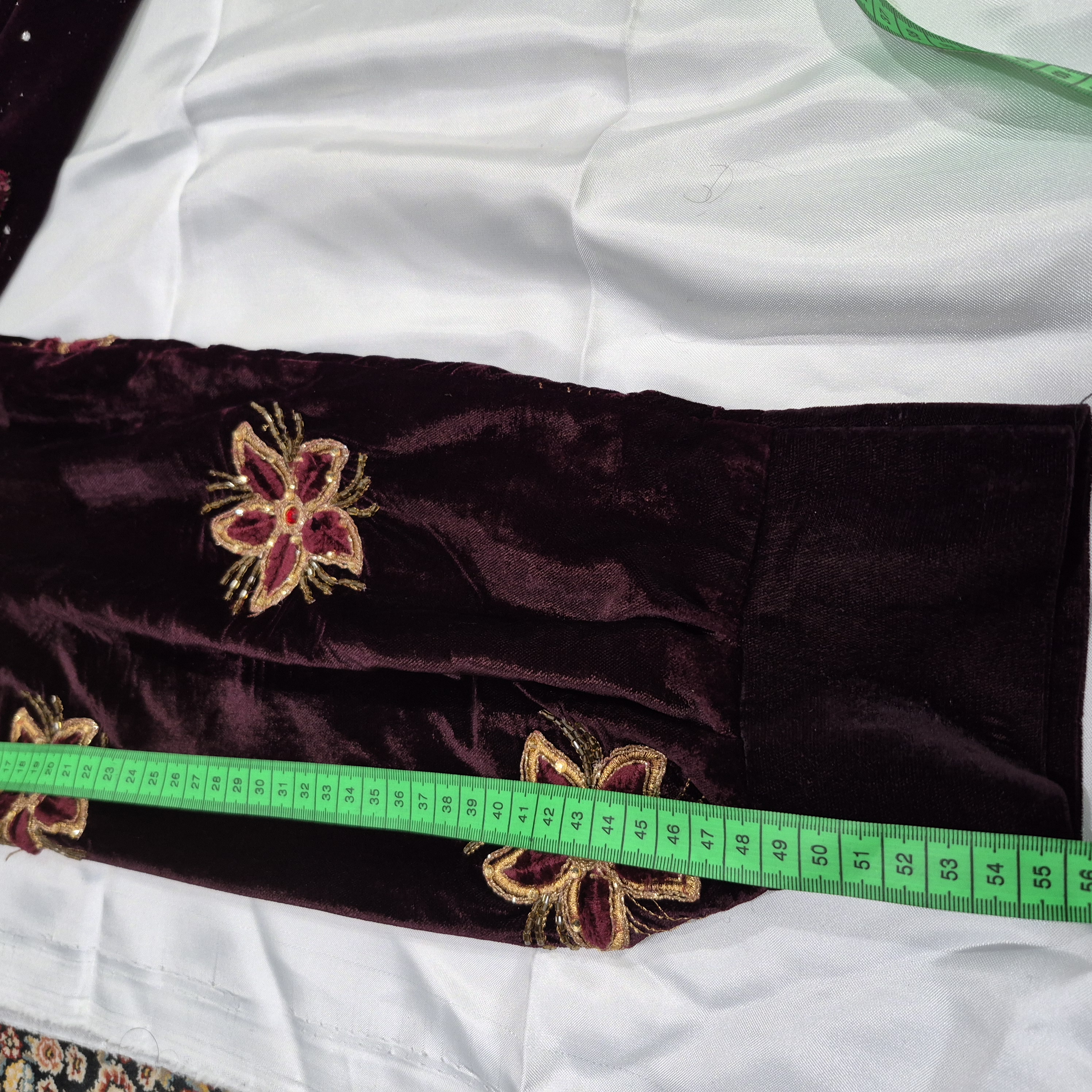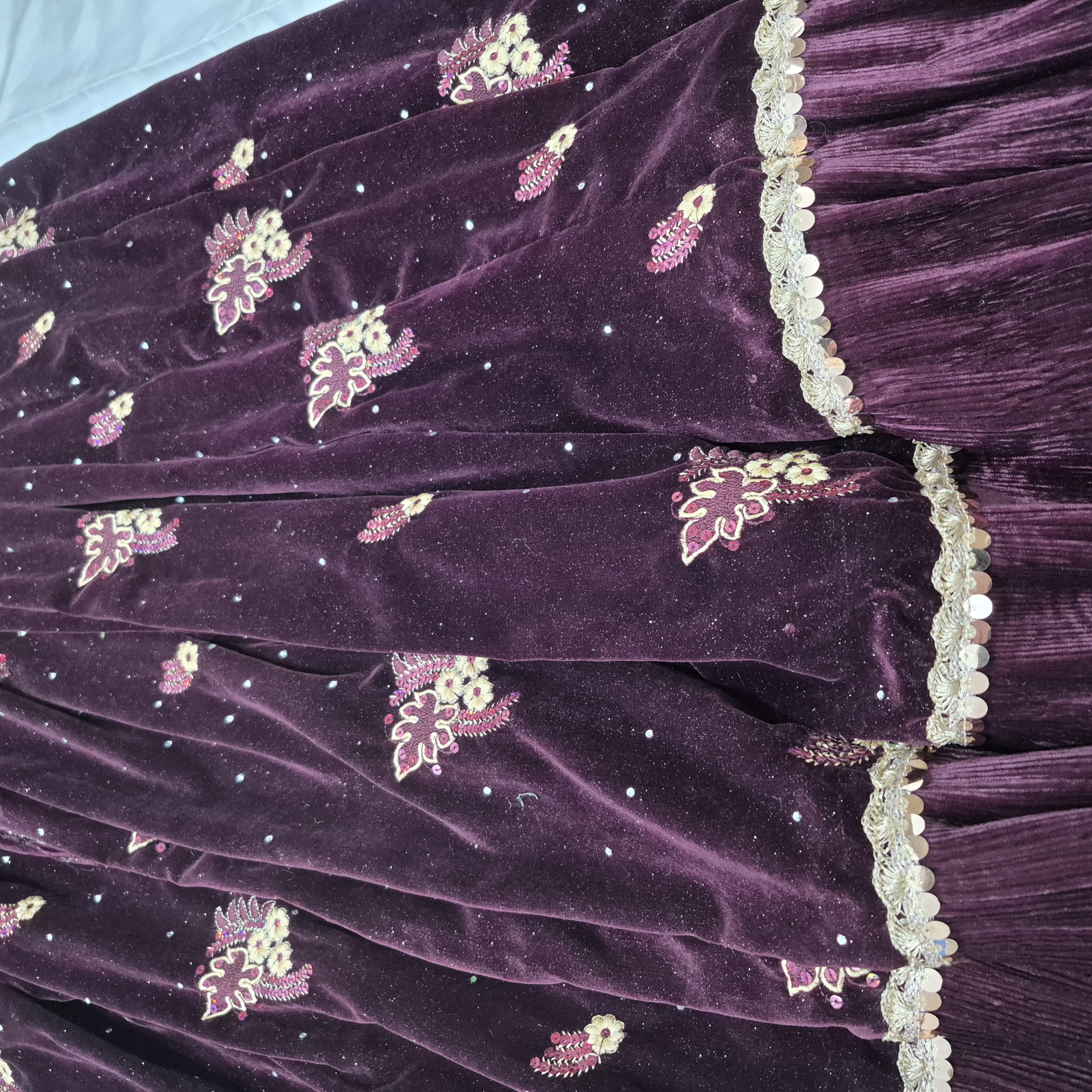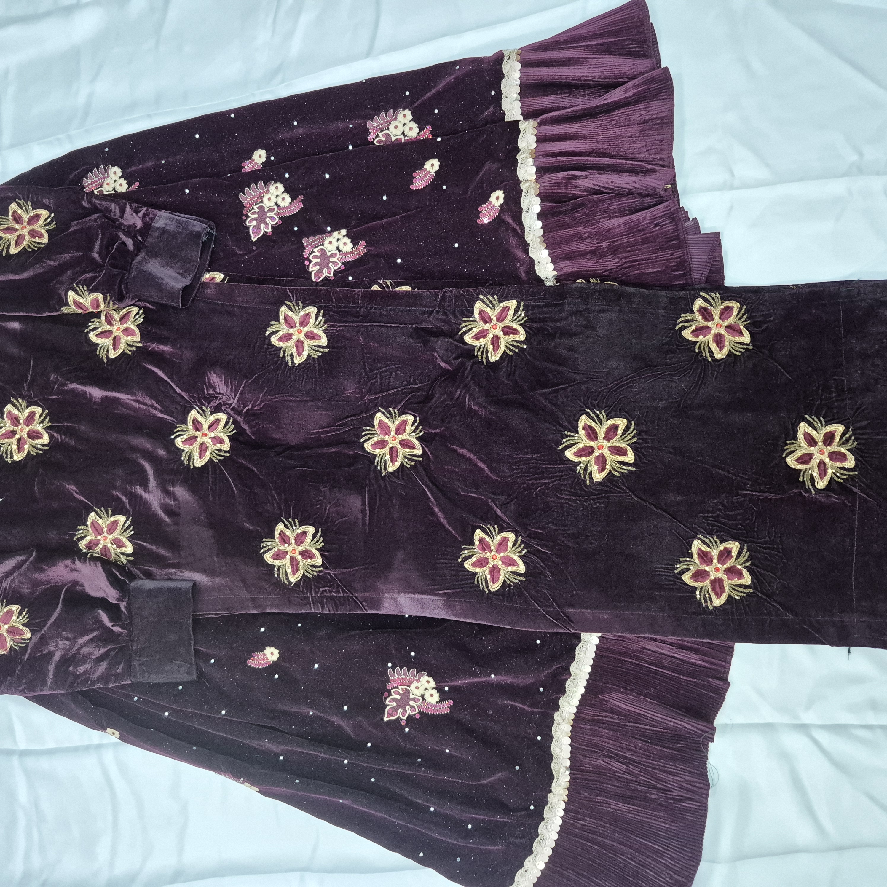 لباس محلی زنانه از جنس مخمل و عنابی رنگ به فروش می رسد.